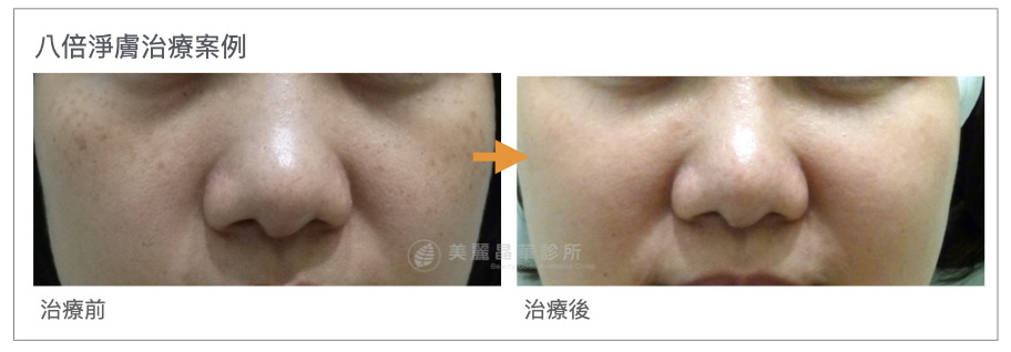 八倍淨膚雷射,擁有 1064nm+532nm 兩段波長輸出,能量密度比傳統淨膚提高八倍,具備 8ns 和200us 兩種脈衝時間,特有飛梭化能量分佈,可有效破壞黑色素和刺激膠原蛋白活化,有效解決肌膚多重問題。 1. 肌膚暗沈色素不均,蠟黃 2. 毛孔粗大,膚質粗糙無光澤,皮膚細紋,出油旺盛 3. 斑點、黑眼圈,黑痘疤 4. 發炎後色素沈澱 (蚊蟲叮咬,傷口引起的色素)淨膚雷射價格 5. 肝斑 6. 傳統雷射反黑淨< 眾多知名網路名人 分享八倍淨膚雷射 全紀錄!>